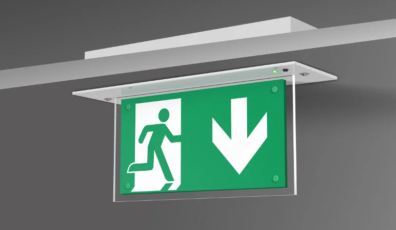 Die LED Rettungszeichenleuchte eignet sich für den Anbau an Decken (Deckeneinbau). Die Leuchte EXIT 25E in den Varianten doppelseitig unten, doppelseitig links und doppelseitig rechts erhältlich. In Verbindung mit dem mitgelieferten LED Treiber erfüllt die LED Einzelbatterie-Rettungszeichenleuchte die EMV-Richtlinie.